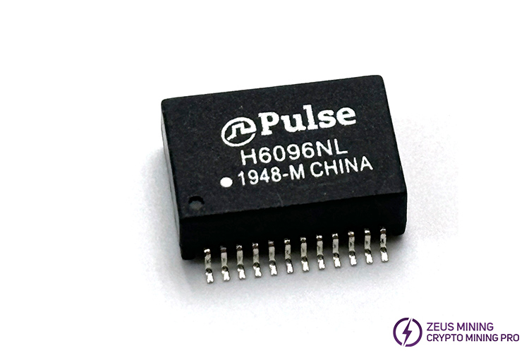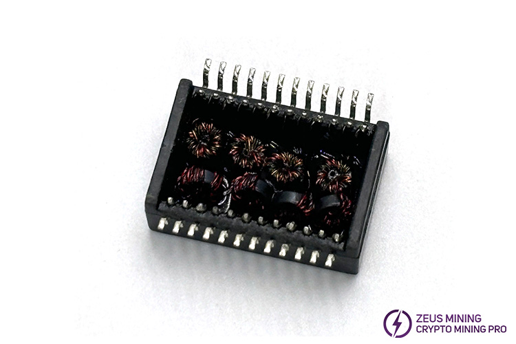 24-pin 350µH LAN 10/100/1000 Base-T pulse transformer 1CT:1CT transmitter, 1CT:1CT receiver surface mount single-port transformer module, flammability class IL 94V-0 or better thermoset plastic material.