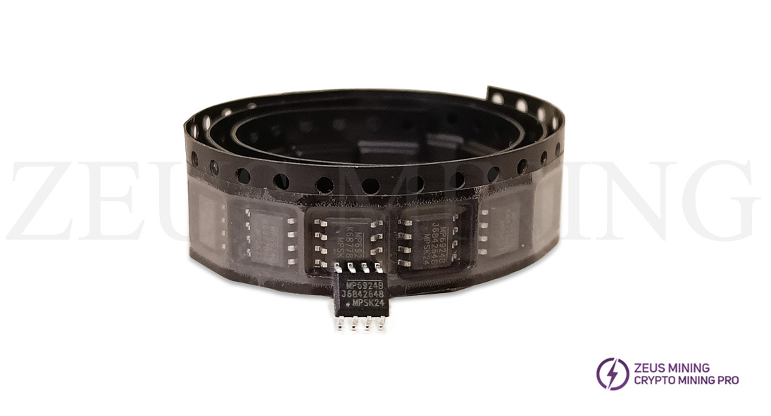 The high quality MP6924BGS is available in SOP-8 package, which is usually used for Whatsminer hash board switching power supply control chip. The MP6924BGS IC drives two N-channel MOSFETs and regulates their forward voltage drop to about 45mV and turns them off before the switch current goes negative, with light load capability to lock the gate driver under light load conditions, thereby limiting the current to 175µA.