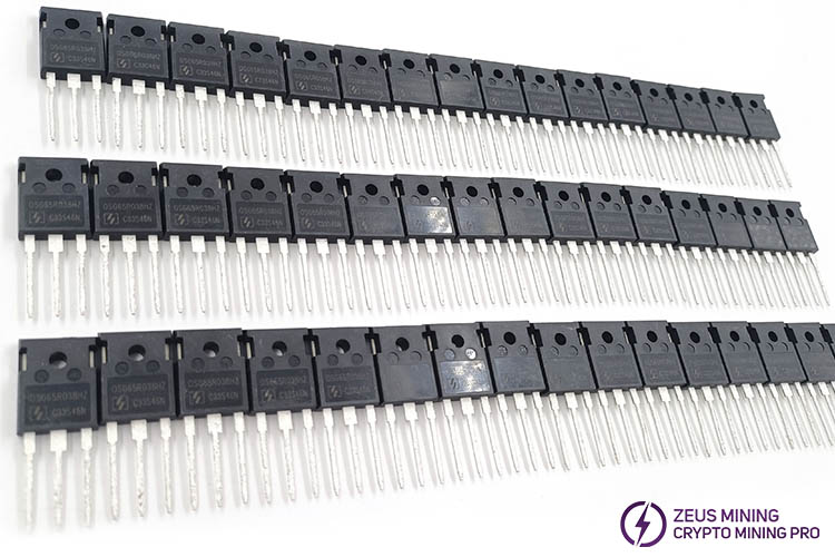The MOSFET transistor OSG65R038HZ is an N-channel power MOSFET on Antminer APW171215A PSU. The transistor has a voltage tolerance of 600 volts and a maximum current of 80 amps.