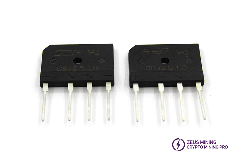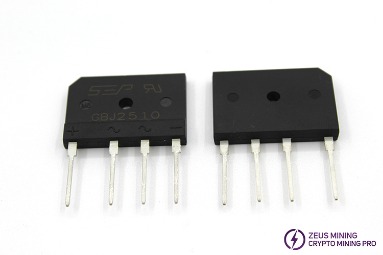 The GBJ2510-F 25A glass passivated bridge rectifier features a molded plastic case material, surge overload rating up to 350A peak, lead-free finish, and is RoHS compliant.