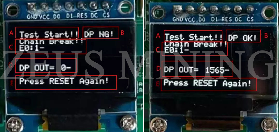 E. "Press RESET Again!" indicates that the test has ended. Please press the reset button 7 of the test fixture to repeat the test.