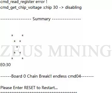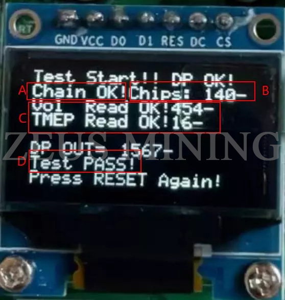 The voltage and temperature information read from the hash board will be displayed before increasing the operating frequency. Press Enter to confirm the frequency increase. If the hash board chain fails, it will enter the maintenance mode and send maintenance instructions to the hash board without interruption. The power supply will not be interrupted, and an oscilloscope will be used to locate the faulty chip.