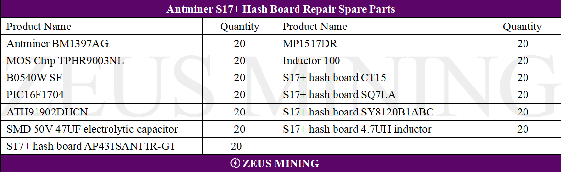 Antminer S17+ Hash Board Spare Parts Kit,that if the s17+ hash board is in an unsafe operating state for a long time, it will cause the interruption of the operation of the s17+ miner. For example, Antminer BM1397AG, MOS chip TPHR9003NL, PIC16F1704, ATH91902DHCN, MP1517DR,100 inductors, SMD 50V 47UF electrolytic capacitors, etc. which require regular maintenance and repair of the miner parts, to play a preventive role and ensure efficient production efficiency.