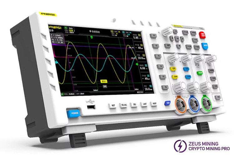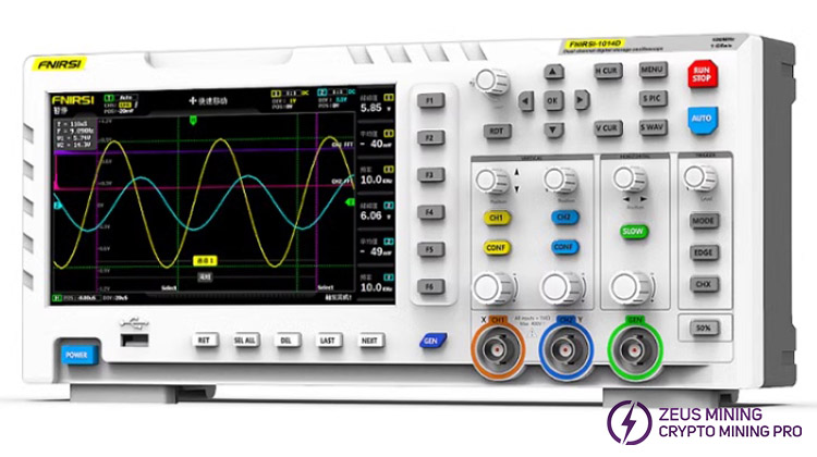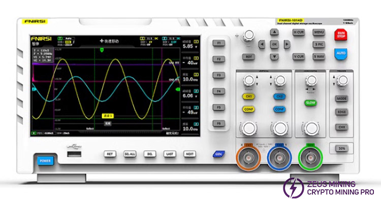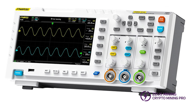 FNIRSI-1014D Digital Oscilloscope Signal Generator 1014D is a two-in-one oscilloscope and signal generator. It is a cost-effective dual-channel desktop oscilloscope for the miner maintenance industry and the R&D industry. This oscilloscope has a real-time sampling rate of up to 1GSa/s, an analog bandwidth of 100MHz*2, and a full trigger function. It adopts a 7-inch 800*480 resolution color LCD high-definition liquid crystal display with high contrast, which is a sharp tool for engineering debugging. It can be used in many fields, such as mining rig maintenance and debugging, electronic production, home appliance maintenance, automobile maintenance, scientific research and education, product development, etc.