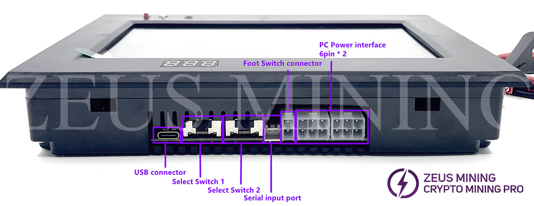 Serial input port: the external serial port connector connects other brands of hash board tester motherboards, such as Antminer, Whatsminer, etc. You can view the test information of the test fixture on the screen.