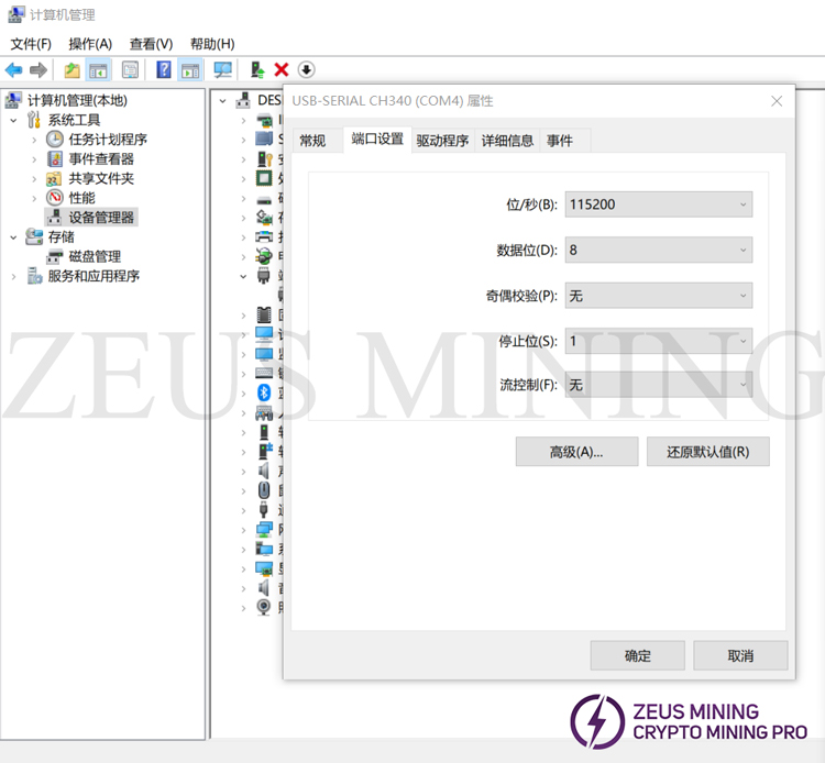 3. Use the USB cable to connect the test board and the computer, then open the device manager of the computer, find the corresponding port, and set the baud rate of the port to 115200.