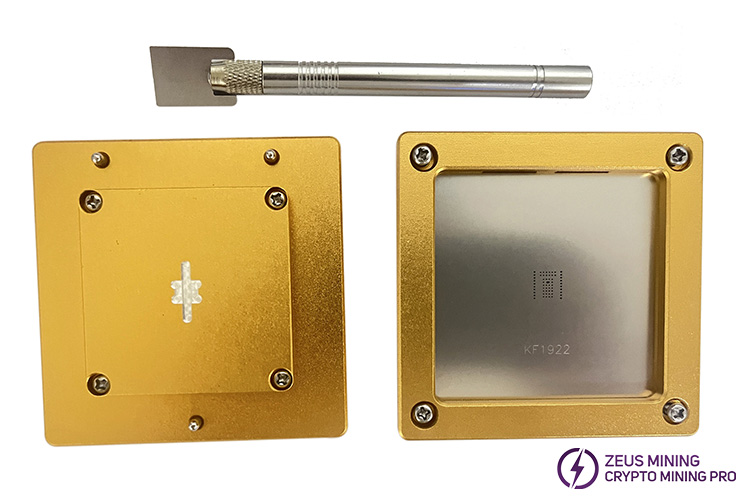 We sell high-quality KF1922 ASIC chip tin tools for repairing Whatsminer M20, M20S, M21, and M21S chipsets. A complete set of tinning tools includes a tinning tool base, cover, and tinned stencil for quick tinning repairs to replacement chips. Ultra-high precision laser CNC machine tools punch the tin-plated holes of the tin stencil. The hole is round without burrs, and the chip feet are positioned accurately. While protecting the chip ensures that the stencil is more durable.