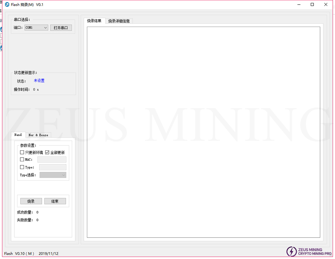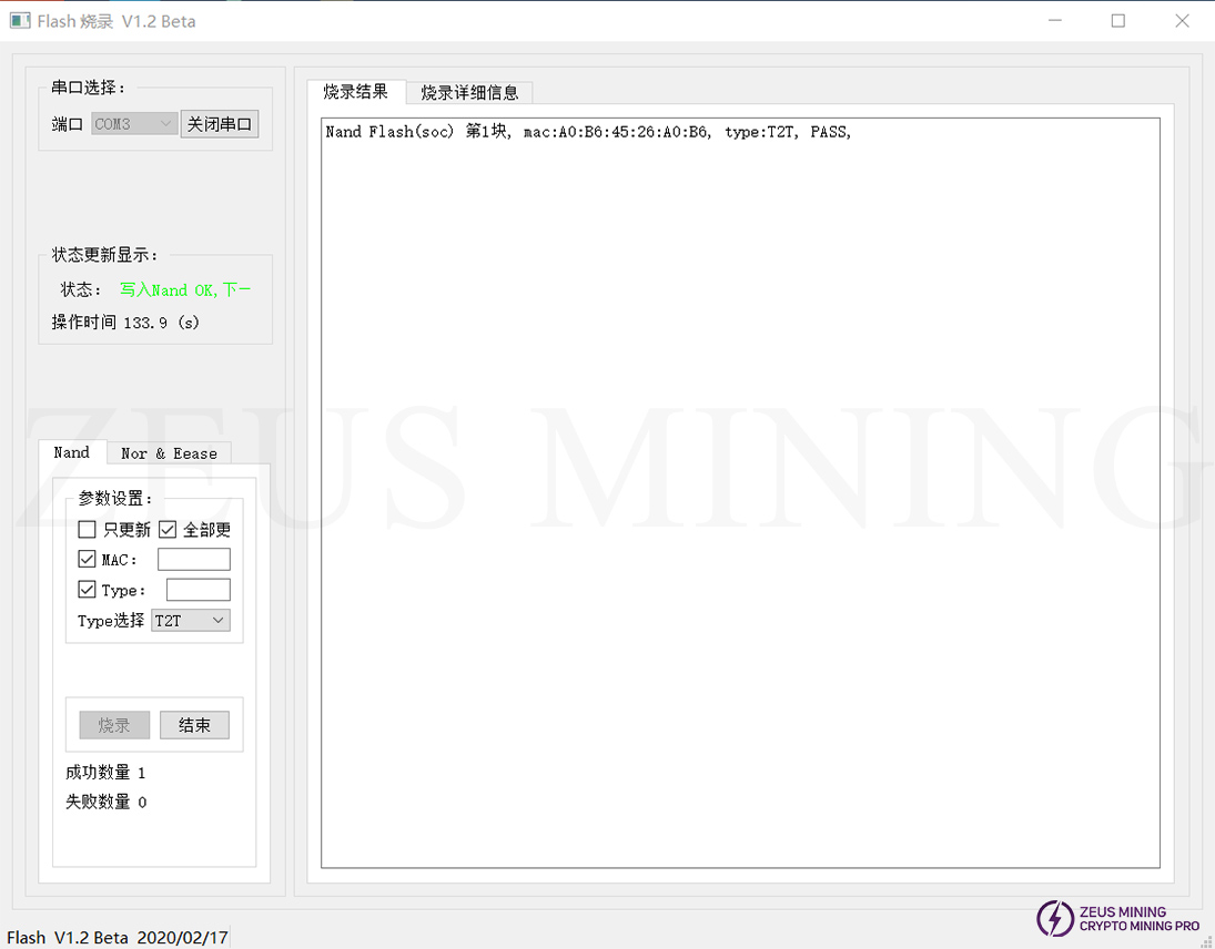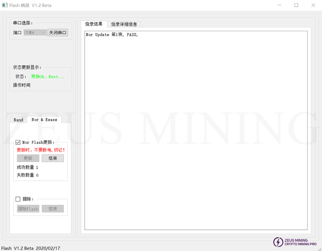 d) Click the update button, power on the control board, and update the Nor Flash automatically, as shown in the figure:
