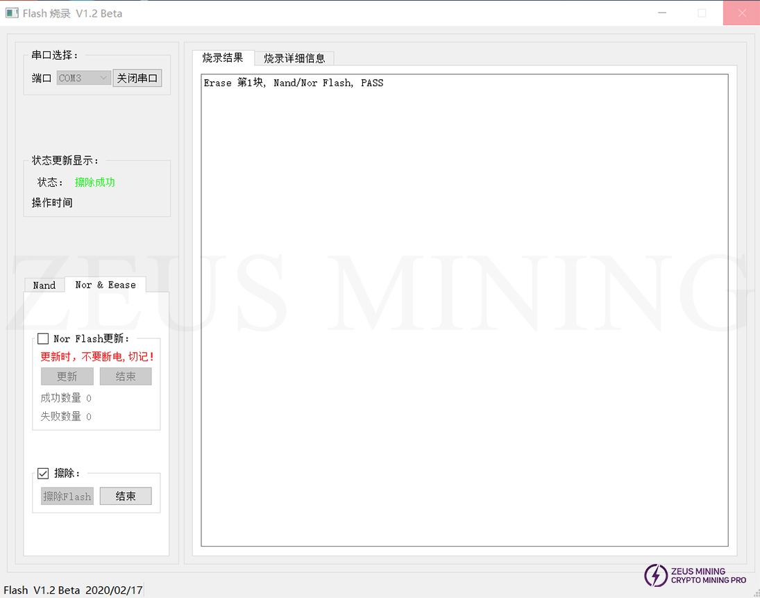Click to open the serial port, select "Nor&EEASE," check the erase box and the erase Flash button is available at this time; click the erase Flash button, power on the control board, and erase automatically, as shown in the figure: