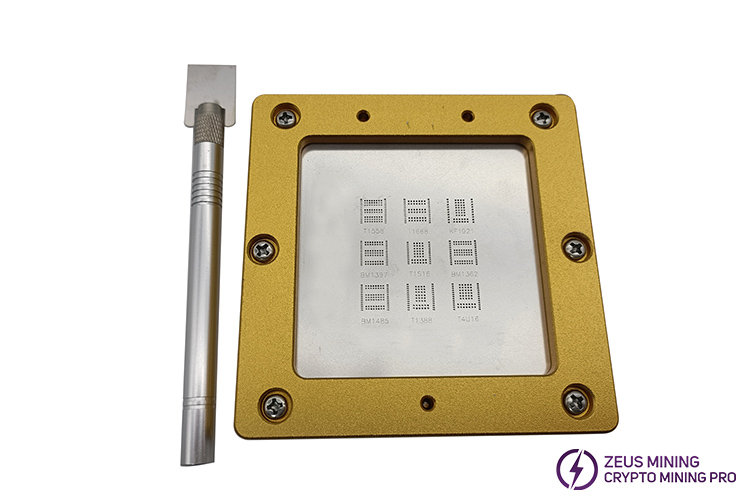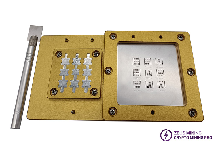 The chip tinning tool is a multi-functional test fixture integrating 9 kinds of chips, including T1558, T1668, KF1921, BM1397, T1S16, BM1362, BM1485, T1338, and T4U16. It is convenient and faster to tin-plate multiple different chips simultaneously. Using electric and high-temperature resistant composite materials can effectively prevent the generation of charges and protect the chip during the process of replacing the chip. High-quality steel mesh, precise positioning of holes. It is convenient for the precise tinning of chips. Long service life, high temperature, and wear resistance increase the probability of successful chip welding.