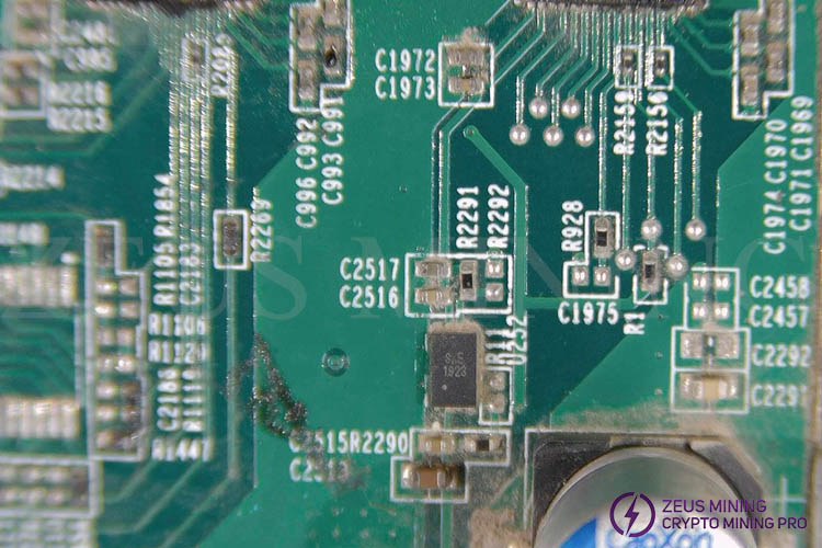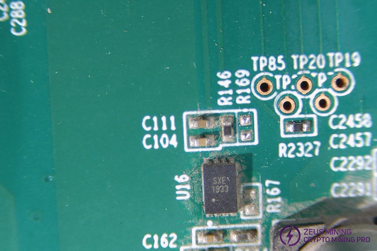 The SXE1923 voltage monitoring chip is located on the S17, T17, S19 hydro hash board of the Antminer and is mainly used to monitor the real-time voltage of the voltage domain of the S17 T17 S19 hydro hash board. When the component is damaged, the front boost chip will not be able to receive the returned data and stop working, failing the hash board to start. In addition, the hash board is susceptible to electromagnetic interference from adjacent hash boards, which affects the 25Mhz clock signal, resulting in unstable operation, inaccurate temperature monitoring, and repeated startups.