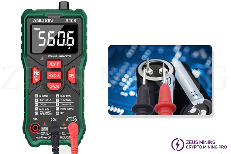 ④ After the capacitor under test is fully discharged, connect the other ends of the red and black test leads to both ends of the capacitor under test for measurement. And the measured capacitance value is read by the liquid crystal display.