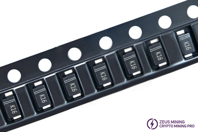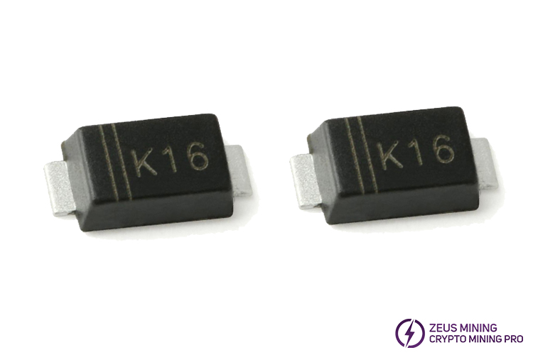 DS16W 1A 60V brand new original Schottky SMD diode, silk screen K16, SOD-123 package, located on Ebit E12 hash board, with low power consumption, high efficiency, and other characteristics, often used in low voltage, high-frequency inverter, freewheeling, and polarity protection applications.