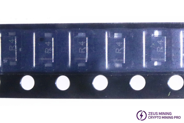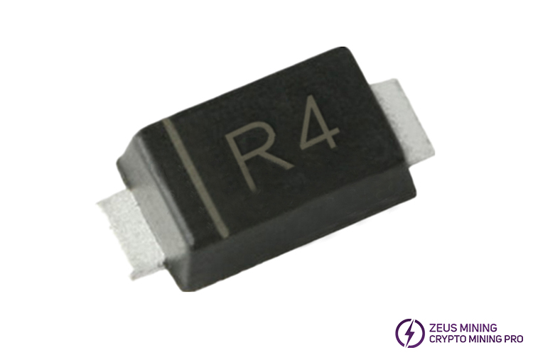 SS2040LL 40V 2A Surface Mount Schottky Barrier Rectifier, SOD123 package, silkscreen as R4, located on Whatsmienr hash board. Because of its low power consumption, high efficiency, and low forward voltage, it is very suitable for automatically inserting surface mount packages.