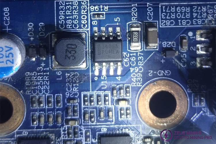 MC34063A 1.5 A, step-up/buck/inverting switching regulator on the Avalon 8 series PMU, the device includes an internal temperature compensated reference, comparators, controlled duty cycle oscillator with source current limit circuit, driver, and high current output switch. This family is specifically designed for integration into the buck, boost, and inverting voltage applications with a minimum number of external components.