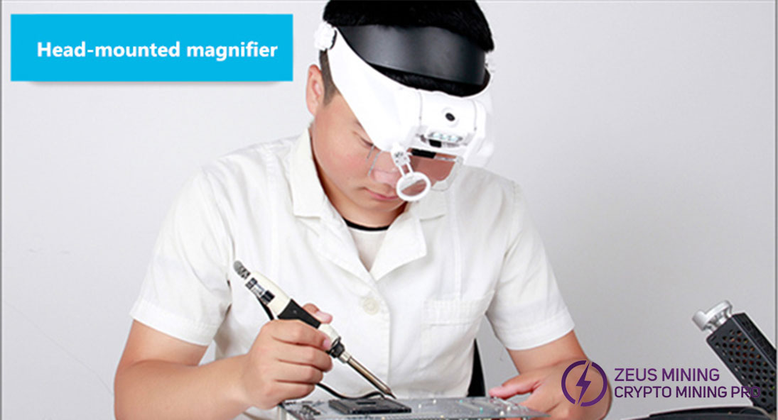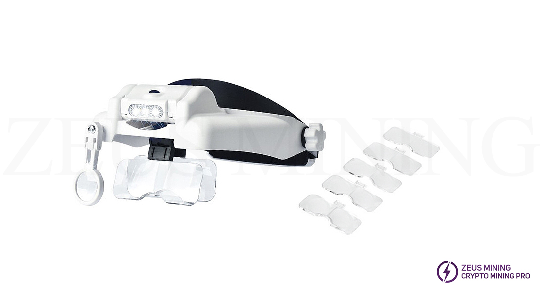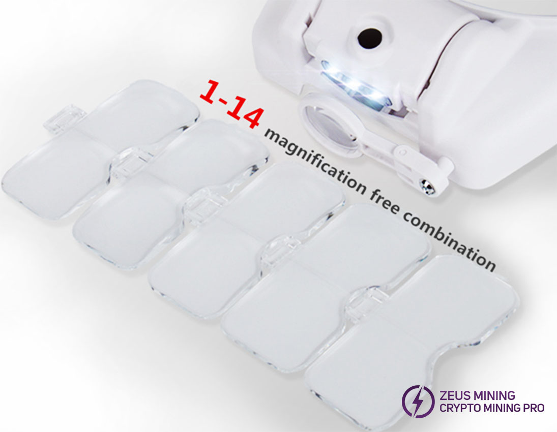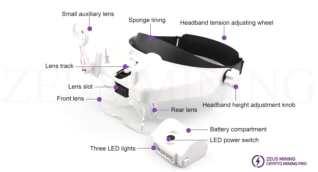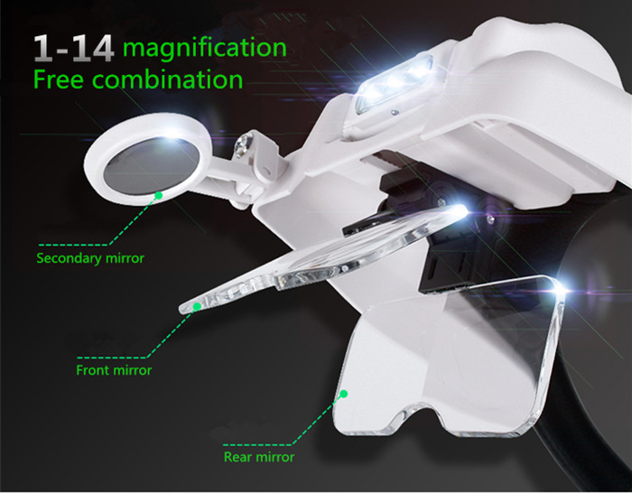 Head-mounted maintenance magnifier, multiple sets of lenses, multiple magnifications, suitable for watch, mechanical and electronic maintenance. Three-mirror superposition combination, 1-14 times magnification can be changed at will. Wrapped in breathable knitted fabric, soft padding, comfortable to wear; 3 white LEDs, adjustable angle; front and rear movable lens design, users with different eyesight can adjust the lens group front and back to focus clearly.