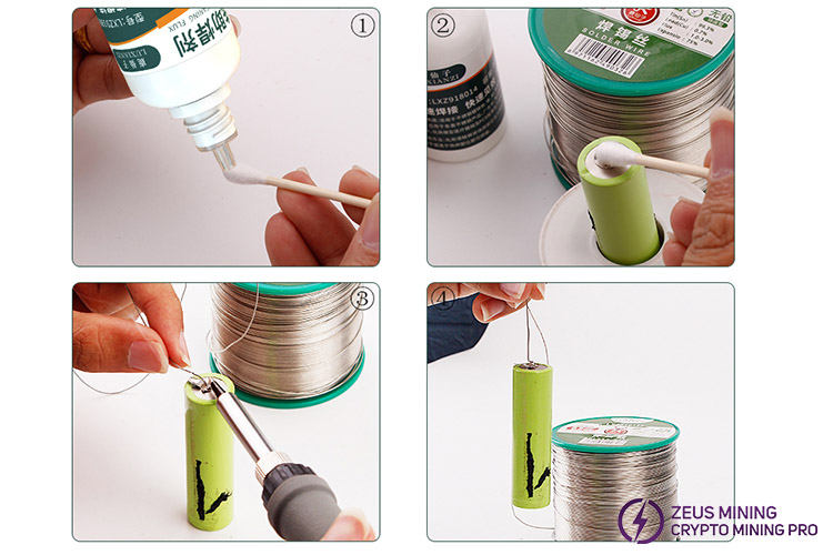 2. Wipe the positive terminal of the battery repeatedly with a cotton swab with flux;