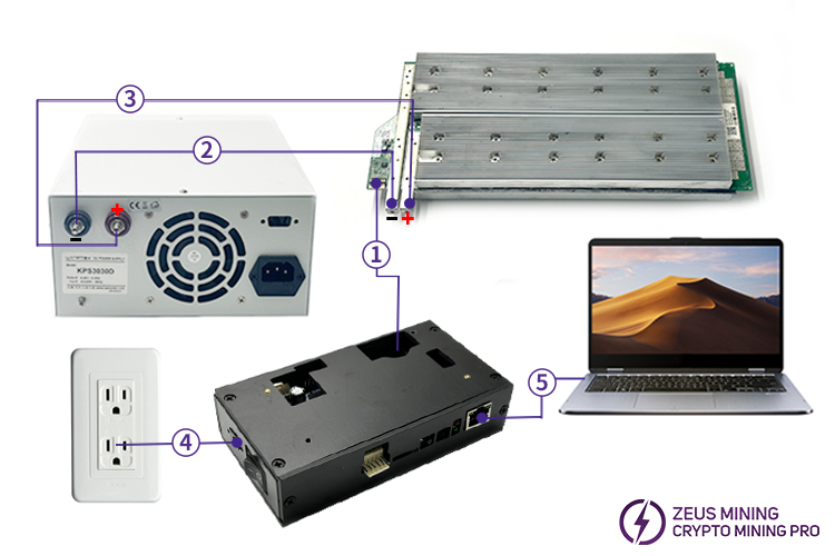 ② and ③ Alligator clip power cable 6mm: connect the positive and negative electrodes of the voltage regulating power supply and the hash board respectively;