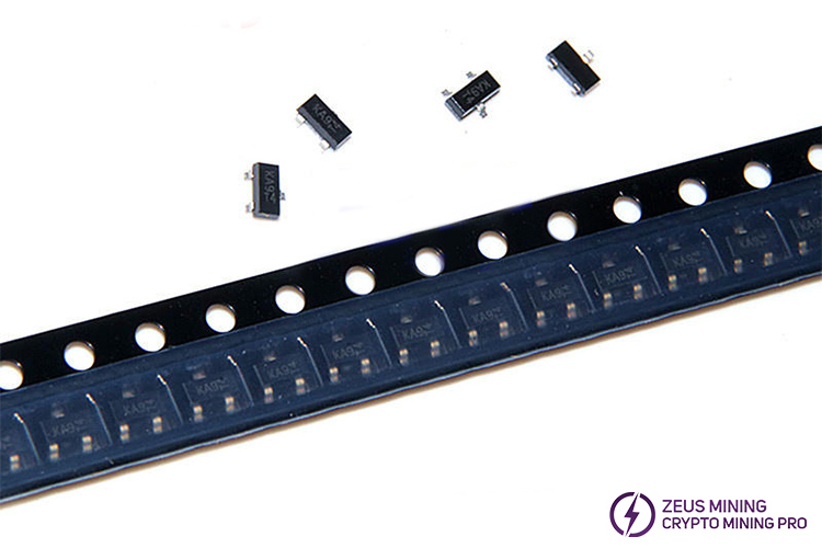MMBD2004S-7-F is an SMD switching diode marked KA9 or KAE on the silk screen. It is packaged in SOT-23 and located on the Whatsminer control board. Its switching speed is fast, and it is very suitable for the automatic insertion of surface mount packages.
