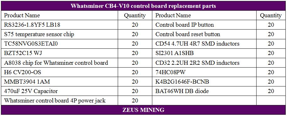 Whatsminer CB4-V10 control board spare parts maintenance BOM list is convenient for everyone to maintain miners in time and reduce unnecessary losses during maintenance. In addition, the CB4-V10 version of the control board is an integral part of the Whatsminer m20s m21s m30s m30 m31s+ m32 m30s+ miner operation. Among them, the Whatsminer control board 4P power jack, MMBT3904 1AM, H6 CV200-OS, SI2301 A1SHB, CD43 4.7UH 4R7 SMD inductors, Control board IP button, and other accessories in the CB4-V10 control board are relatively fragile after the long-term operation, and have a complete set of CB4-V10 control board accessory kits can replace damaged components in time to reduce failure losses caused by downtime.