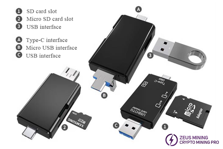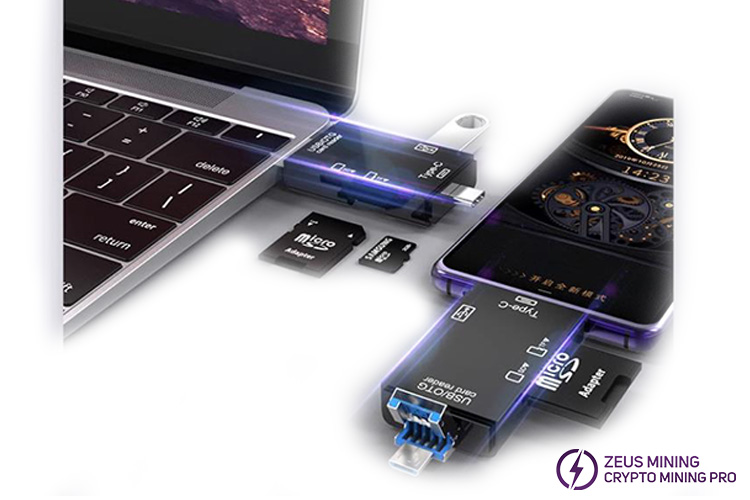 The multi-function card reader sd tf card 6-in-1 USB port is often used for card swiping Antminer A113D control board to ensure stable data transmission. The multi-function card reader has a direct USB/micro USB/Type-C three-in-one interface to expand memory and high-speed transmission. It is compatible with Windows, OS, Linux, Android, and other operating systems and supports various brands of TF/SD memory cards and USB devices.