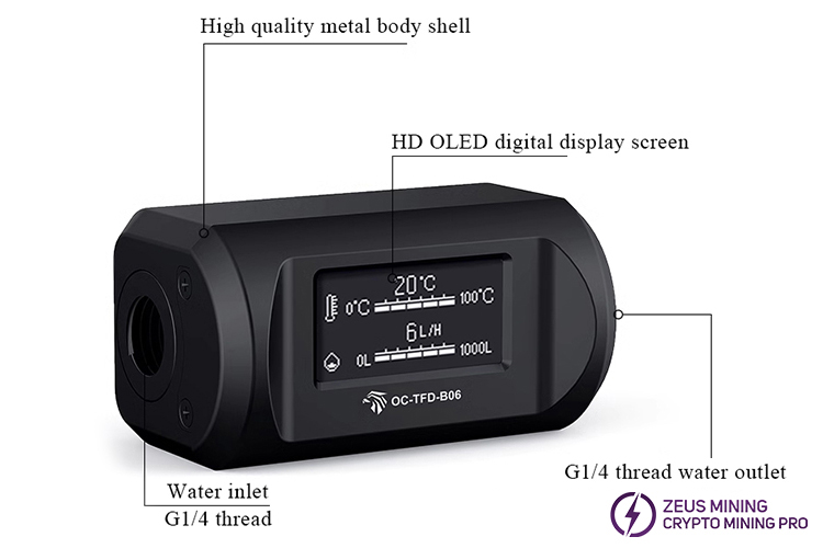 OC-TFD-B06 digital flow meter thermometer uses a high-definition OLED display to perform real-time temperature and flow detection. The sleek appearance is matched with high-quality metal shell material, which doubles the texture. The G1/4 threaded interface provides a better operation guarantee for water-cooling equipment.