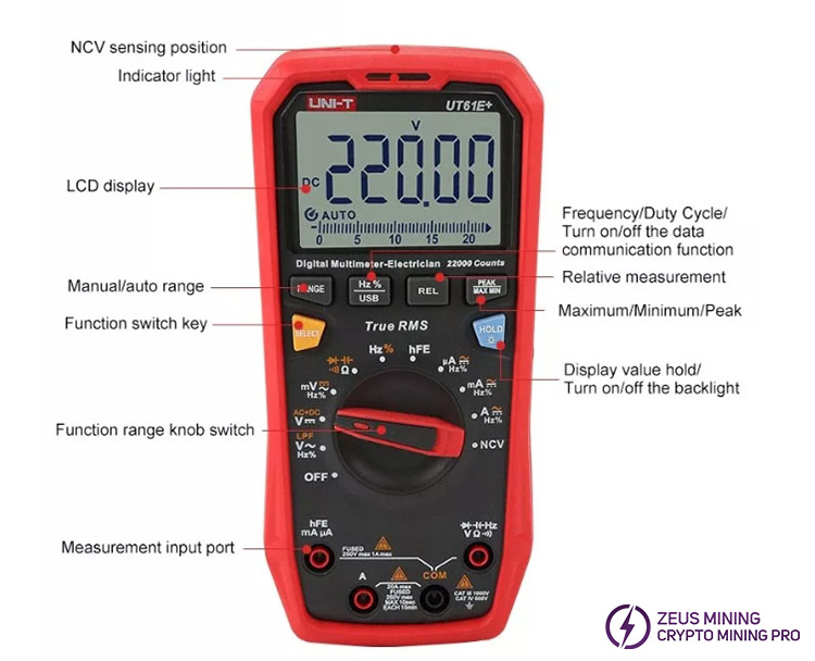 The UT89XD is a reliable handheld digital multimeter with true RMS sine wave measurements. It can measure a maximum 1000V DC/AC voltage, maximum 20A DC/AC current, resistance, capacitance, frequency, diode, hFE, continuity, and NCV, and quickly and accurately distinguish between neutral and live wires. UT89XD is equipped with an LED light-emitting diode detection function, which can test the usage of LED lights and diagnose their quality. This series of products has sound and light alarms, a flashlight, and automatic backlight functions, which can be used in dark environments. It attracts users with its two-tone durable casing, modern look, and multiple features.