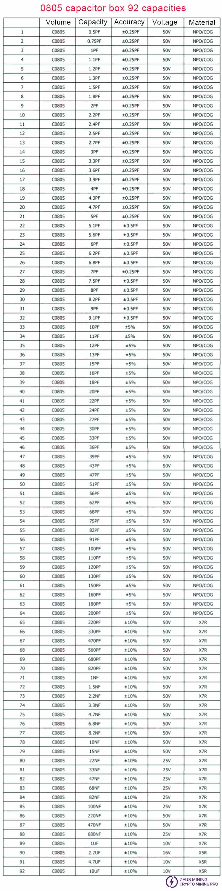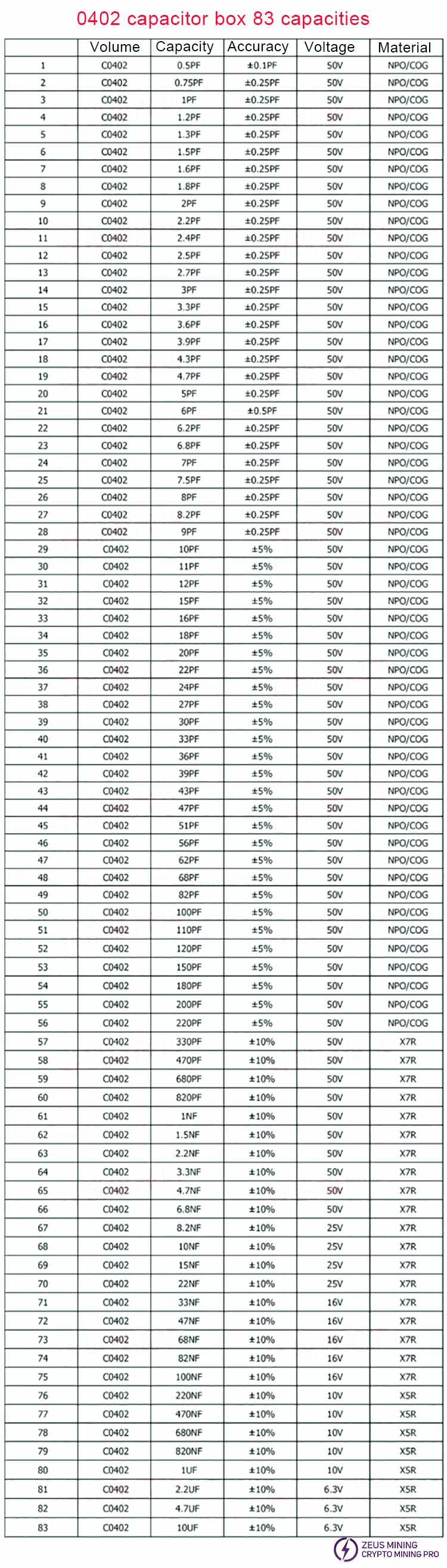 0402 capacitor box contains 83 types of capacitors with different resistance values, 100 pieces each;