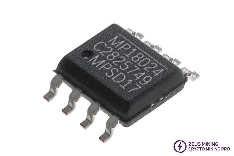 MP18024HN-LF-Z is a high-frequency 100V half-bridge N-channel power MOSFET driver on Antminer APW9 power supply. The silk screen mark is MP18024. Its low-side and high-side driver channels are independently controlled and matched with less than 5ns latency. In the event of insufficient power, undervoltage lockout on the high-side and low-side supplies forces their outputs low.