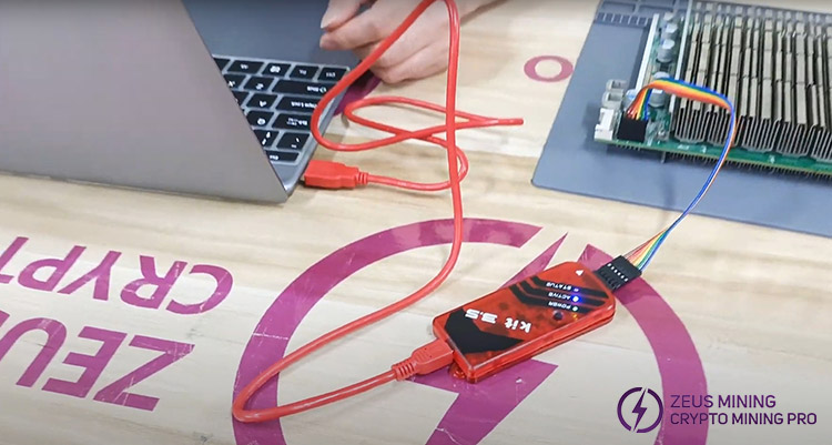 One end of the DuPont cable is connected to the PICKIT programmer, and the other to the Antminer hash board PIC interface.