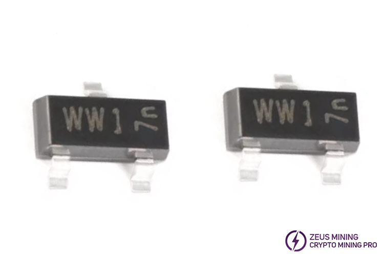BAT54C Schottky barrier diodes with an integrated guard ring for stress protection, encapsulated in a small SOT23 Surface-Mounted Device (SMD) plastic package. It is often used to repair non-working chips on Avalon control boards.