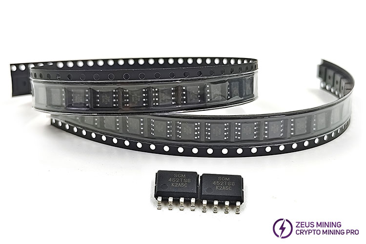 The SGM452TS8 is a digital temperature sensor located on the ASIC miner hash board that detects the hash board's operating temperature. It integrates a sigma-delta analog-to-digital converter (ADC) and an I2C interface with an accuracy of ±1°C in the range of -20°C to +85°C and ±1.2°C in the range of -55°C to +125°C. The device operates from a supply voltage of 2.7V to 5.5V. This temperature sensor's wide temperature, power range, and I2C interface make the SGM452TS8 an ideal choice for many applications where thermal management is critical to performance. It is packaged in a green SOIC-8 package and can operate in an ambient temperature range of -55°C to +125°C.