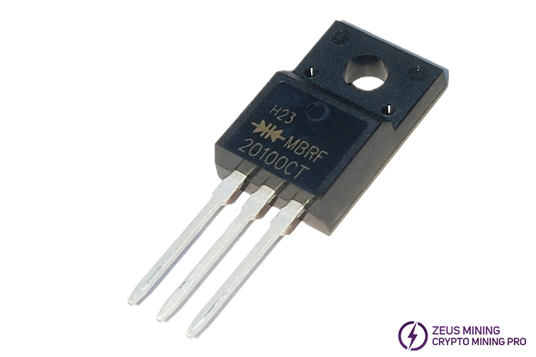 MBRF20100CT is a Schottky rectifier located on the Whatsminer P221B and P222B power supplies. It is packaged in ITO-220AB and is often used to replace the chip on a failed power supply to restore its overall performance.