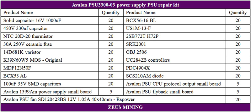 Avalon PSU3300-03 power supply is the replacement PSU for Avalon miner A1056 / A1066 / A1066Pro / A1126Pro-S / A1146Pro / A1166Pro / A1246 / A1266, and is the core of the operation of the mining machine. We have carefully prepared a vulnerable parts package for the PSU3300-03 power supply, and the number of components is wide and diverse, including more than 20 types, which can meet the needs of PSU failure maintenance. The accessories package includes 450V 330uf capacitor, 100uF 35V SMD capacitors, 30A 250V ceramic fuse, GBJ 2506, SCS210AM diode, UC2842B controllers, Avalon PSU fan 40x40mm, K39N60W5 MOS, Avalon PSU small board, etc.