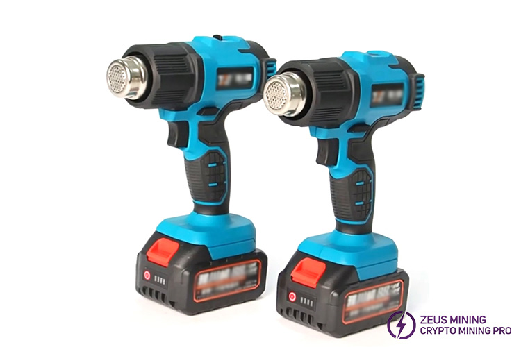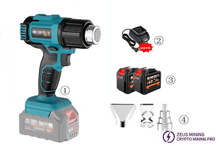 Wireless hot air gun, rechargeable, portable, small, high-power lithium battery hair dryer, car film baking gun, adopts double heating wire design, 3 seconds fast heating, digital display large screen, equipped with high-temperature resistant heat insulation cover to ensure reliable and safe operation. Quick-release nozzle, not hot, can be disassembled by rotating, five wind speeds, 50℃-550℃ adjustable temperature.