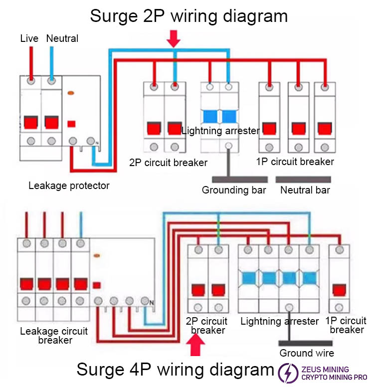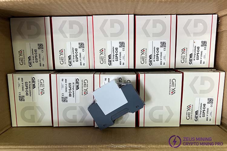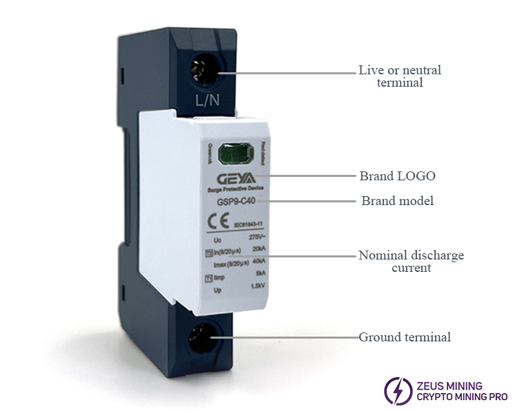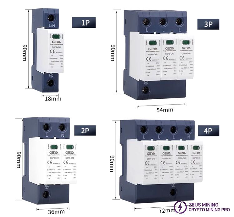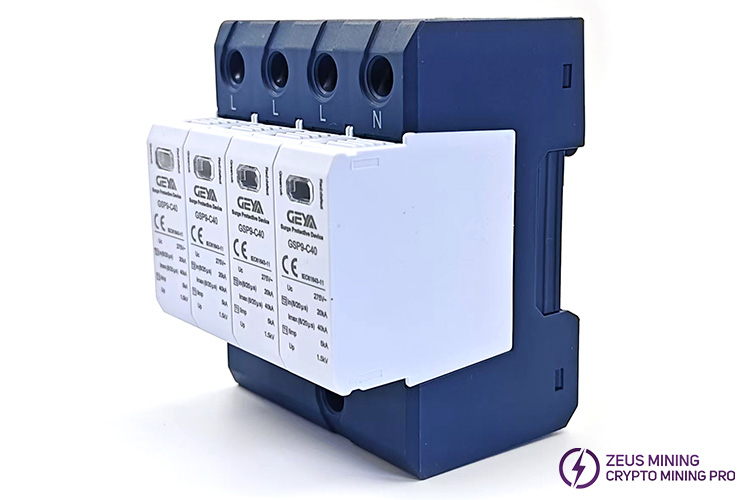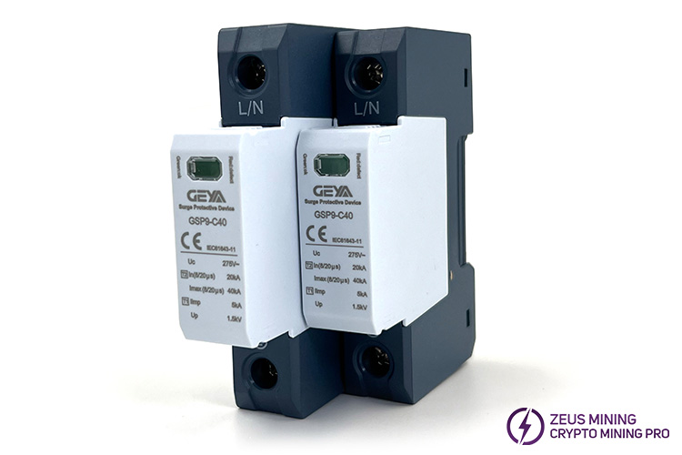 GSP9-C40 40KA series surge protector surge suppressor is suitable for TN-S, TN-CS, TT, IT, and other AC 50/60Hz power supply systems, which protects the ASIC miner mining farm's low-voltage consumer system from all types of overvoltage and provides reliable protection for your mining equipment. The protector shell is made of UL94-V0 flame-retardant material. A fault release is installed on the surge protector module. When the SPD fails due to overheating or overcurrent, the fault release will help the electrical equipment to separate from the power system and send out an indication signal. Green means normal, and red means abnormal. The module can also be replaced when there is working voltage.