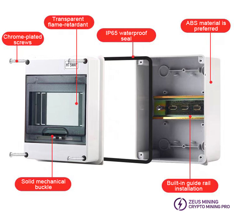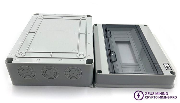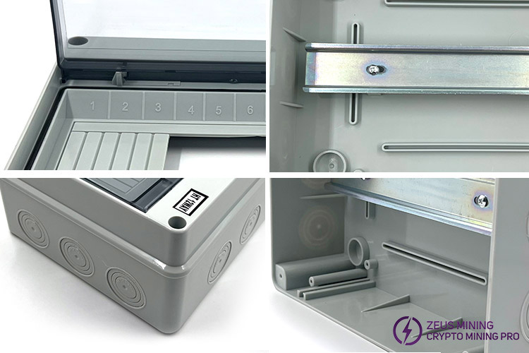 The distribution box mask adopts a press-type opening and closing method. The mask can be opened by pressing lightly. When it is opened, it is equipped with a self-locking hinge structure. The distribution box has a built-in standard rail, and the rail support plate can be raised and lowered to the highest active point. The installation of wires is no longer limited by narrow space. For easy installation, the distribution box switch is equipped with a wire trough and a wire pipe outlet hole, which is convenient for adapting to various wire troughs and pipes. It is suitable for indoor and outdoor electrical, communication, and fire-fighting equipment in ASIC miner mining farms, lawns, toilets, swimming pools, and other places.
