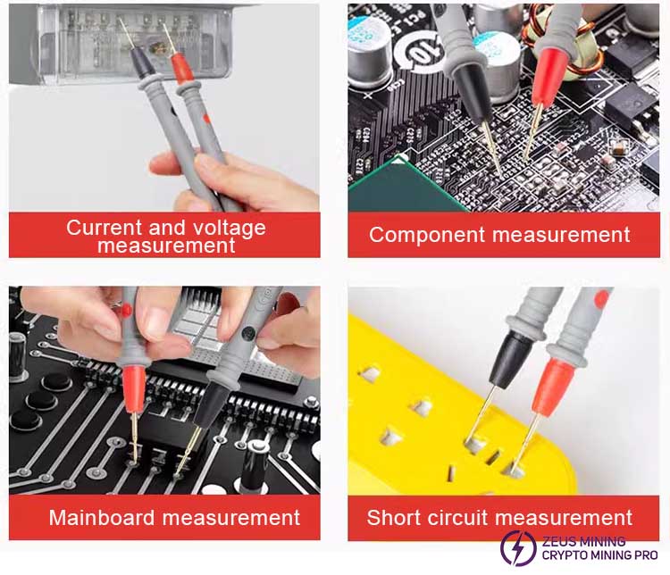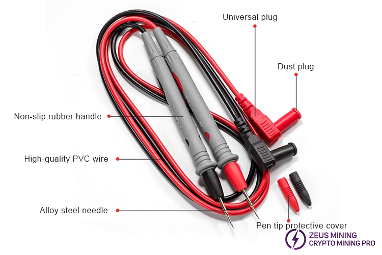20A 1000V high-quality multi-function digital multimeter probe test lead is a spare kit for replacing multimeter components. It is small and exquisite in design and compatible with 99% of multimeters. The outer layer is made of insulated flexible PVC material to ensure that the test lead is sturdy, flexible, anti-freeze, heat-resistant, and has other characteristics. With CAT-1000V safety rating, it can stably and safely test high voltages up to 1000V 20A. The tip of the multimeter probe test lead is not easy to break, and it is easy to get a small contact point on a high-density board. It is commonly used to measure ASIC miner hash board components' current, voltage, resistance, transistors, diodes, etc.
