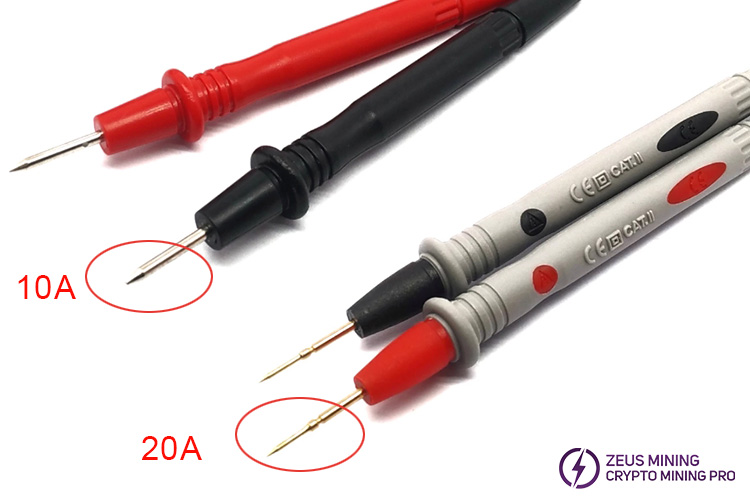 The 20A test lead has a sharper needle than the 10A test lead, which is more conducive to testing precision components.