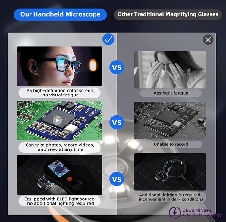 The 500X Handheld Digital Microscope is a compact and powerful tool designed for detailed observation, repair, and magnification. It is perfect for repairing ASIC miners. It features a 2MP camera resolution and up to 500X magnification, providing crisp HD images and videos. Its integrated 2.0 inch IPS screen with a 178° wide viewing angle displays your findings clearly and vividly. This portable microscope is practical and stylish and available in white or black.