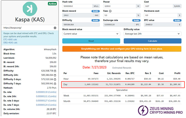 According to the Kaspa currency price calculation, the daily profit of KS3L 5T miners on July 27 was $1,209.66. As the currency price rises, the profit amount will fluctuate. This data is for informational purposes only.