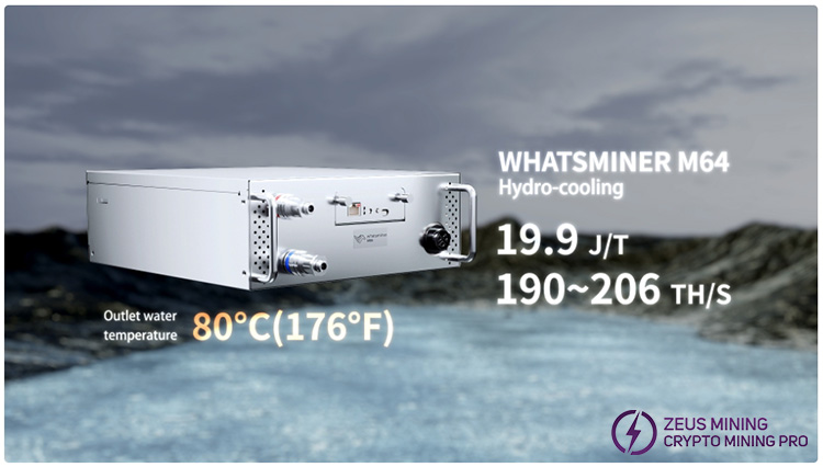 WhatsMiner M64 is a Hydro cooling Bitcoin miner with a hash rate of up to 206TH/s, power consumption of 4099W, and a power efficiency ratio of 19.9J/T, which ensures its best performance while bringing high efficiency and performance to the forefront of cryptocurrency mining. The miner's water outlet temperature can reach up to 80℃ (176℉), supporting continuous and efficient operation.