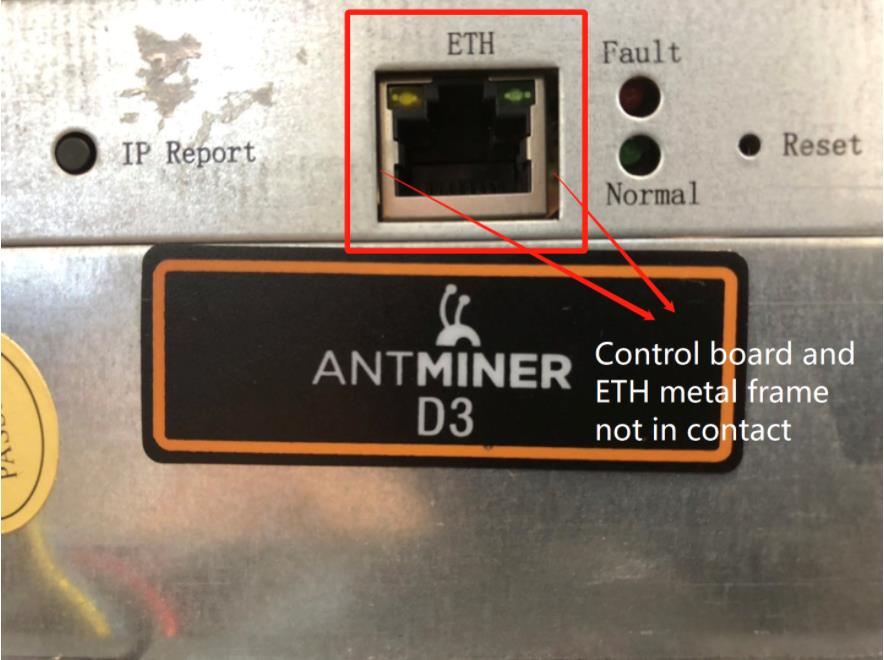 2. This method requires that the metal frame of the miner’s Ethernet interface does not touch the panel of the miner’s control board.