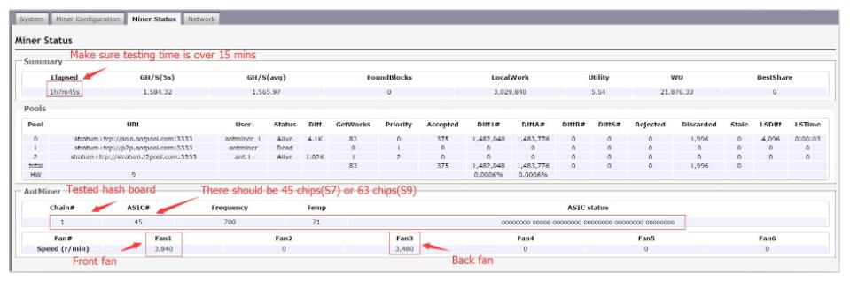 1. Make sure that the power supply (the lights can be found), the control board (the miner status can be found) and the two fans can work normally.