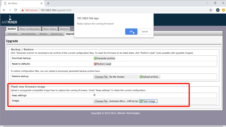 3. Enter your miner interface and go to System> Upgrade. Click "Browse" to find the file, and click "Flash" to load the file.