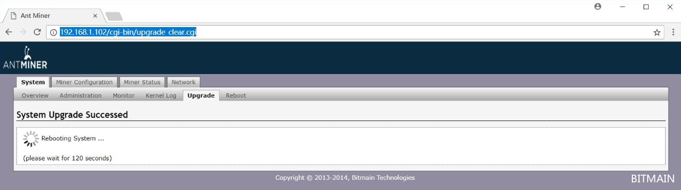 Keep the miner powered on and run for 20 minutes while the firmware is loading. If the upgrade is successful, it will display "System Upgrade Successfully".