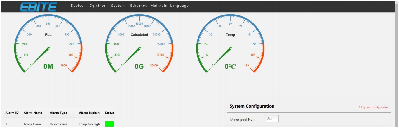 3. After logging in to the miner, click on the device information ----- device status, you can see the device frequency, hash rate, temperature, and the system configuration is displayed on the page (intuitive reaction pool task no response times, power warning, temperature warning threshold, device shutdown temperature threshold, frequency setting, etc.).