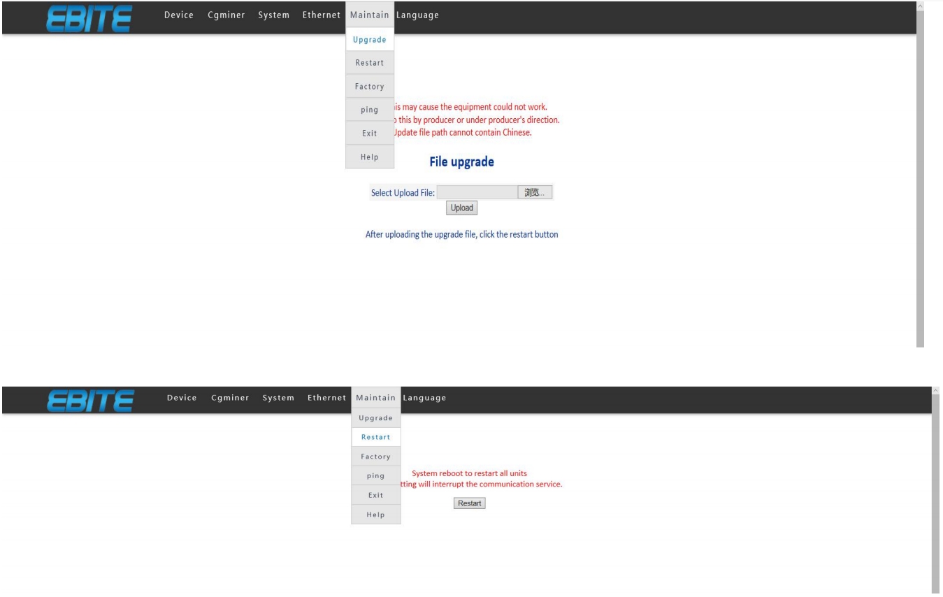7. Click Maintenance Management to enter the upgrade interface. The miner official website will update the device firmware from time to time. At that time, the miner friends can extract and download the upgrade device to improve the device's performance. Note: Failure of the firmware upgrade will cause permanent damage to the system. Please download the firmware from the official website to upgrade. The upgrade file path cannot contain Chinese. Enter the restart interface, and the system restart will restart all units.