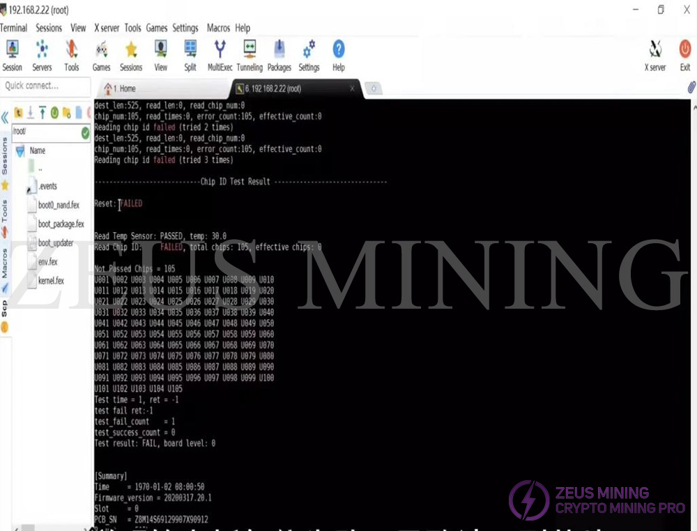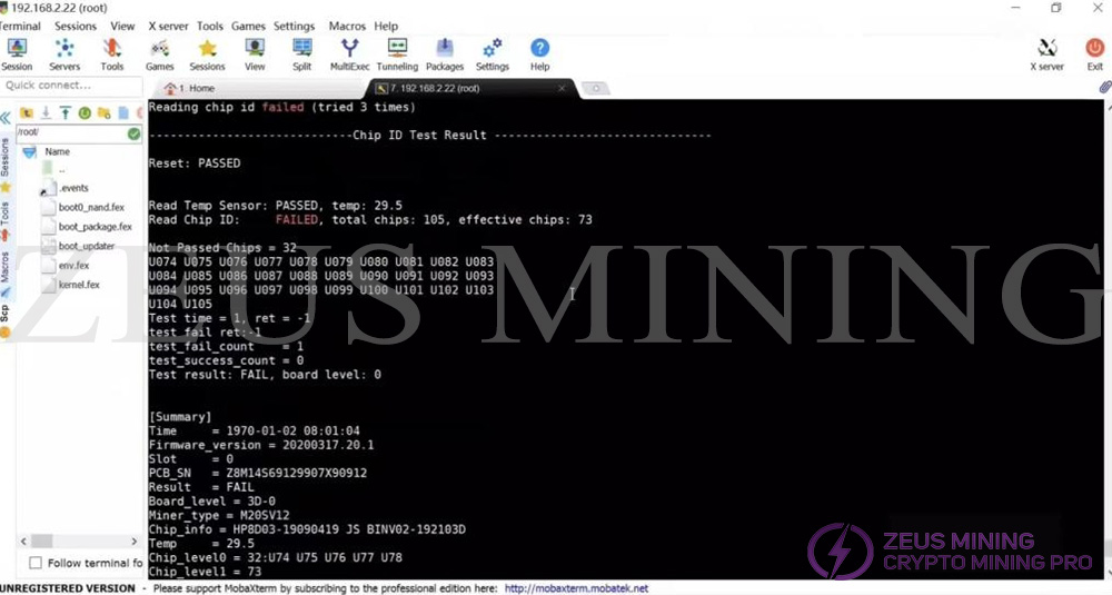 The test log shows that the RST signal of the hash board is normal, the temperature sensor is normal, and the SN code is normal, but the number of ASIC chips is not complete. Normally, 105 chips should be found, but only 73 chips were actually found.