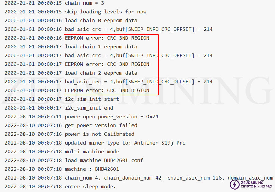 The following fault log comes from the Antminer S19j Pro kernel log, showing an EEPROM error: CRC 3ND REGION. After judging, the EEPROM chip is not working, failing to get the power version and entering sleep mode. In this case, the miner will stop running.